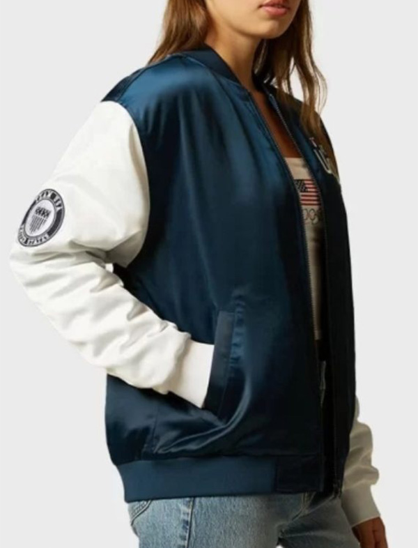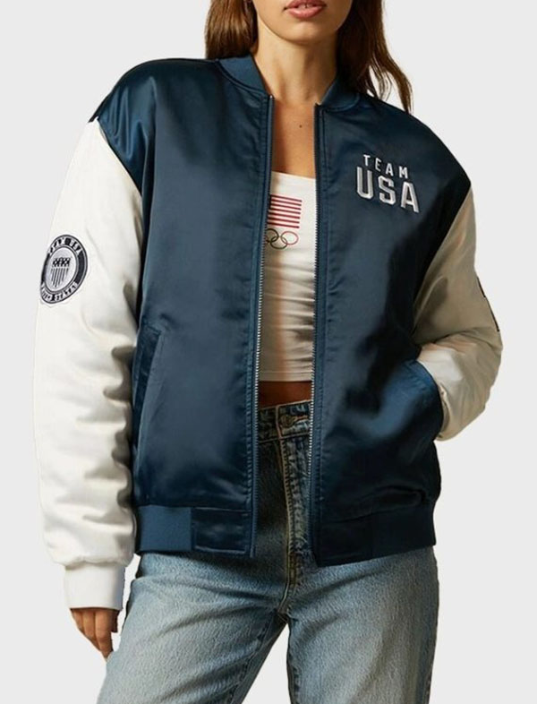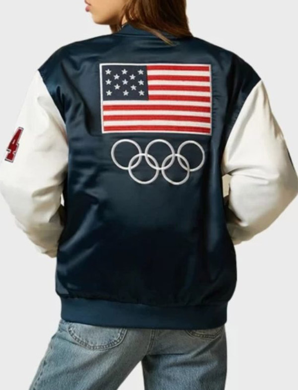 Paris Olympics 2024 Blue White Team USA Varsity Jacket in Satin
