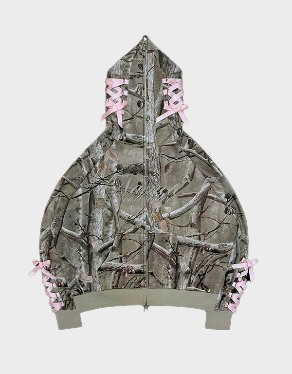 Made from a soft cotton blend, the Camo Bow Hoodie provides a cozy, relaxed fit that’s perfect for all-day wear. The lightweight yet warm fabric makes it an ideal choice for transitioning between seasons, and the adjustable drawstring hood adds extra warmth and functionality. Ribbed cuffs and hem ensure a snug fit, while the oversized silhouette enhances the hoodie’s laid-back, street-inspired look.