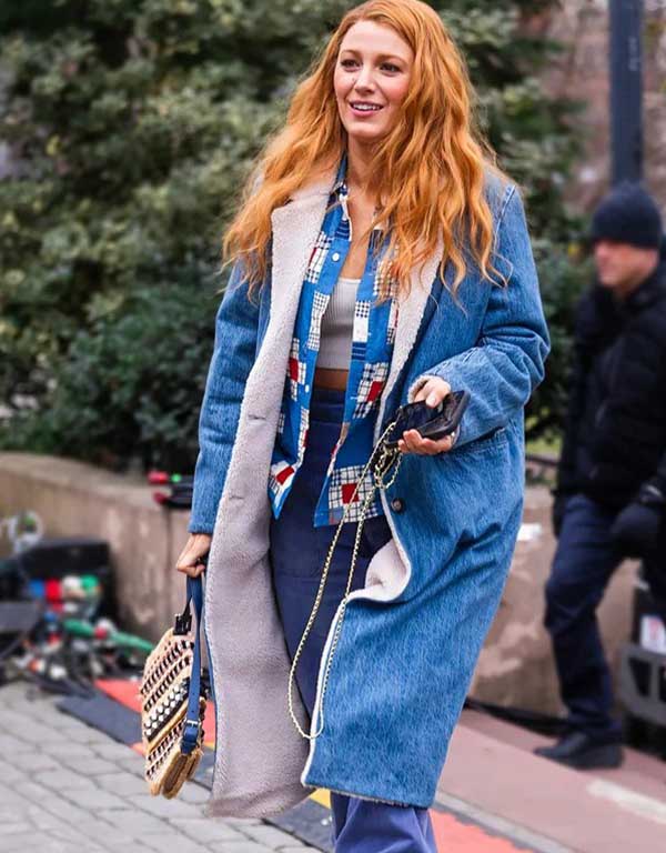 It Ends With Us 2024 Lily Bloom Blake Lively Blue Denim Shearling Coat