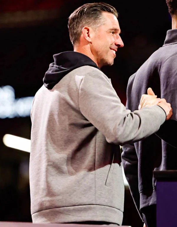 san francisco 49ers super bowl lviii opening night kyle shanahan grey bomber jacket