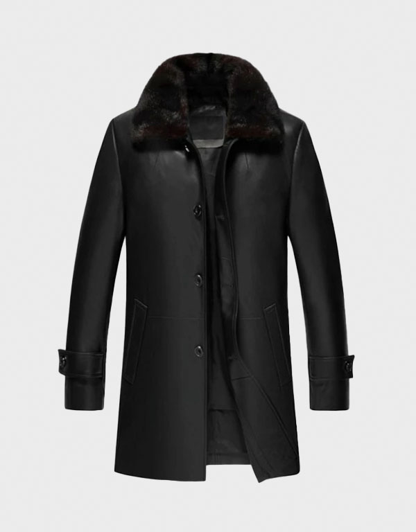 Mens Black Leather Mid-Length Coat with Fur Collar