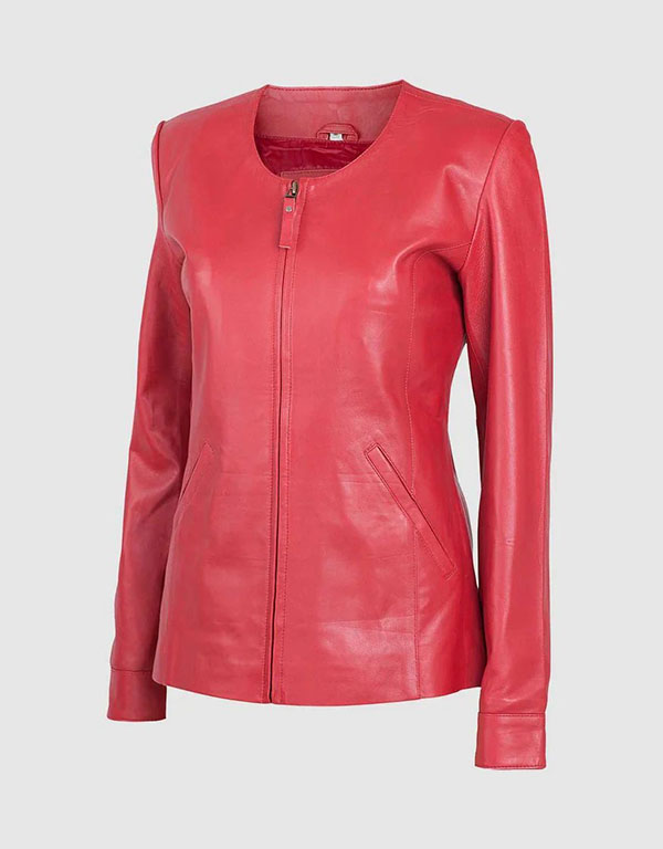 round neck red leather jacket