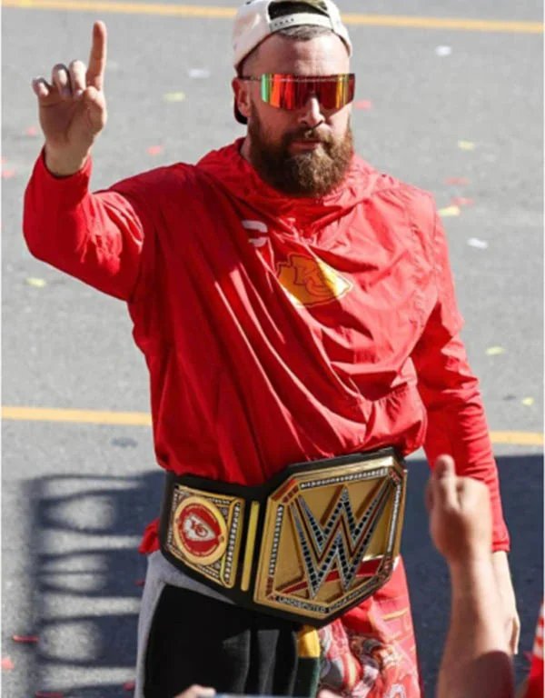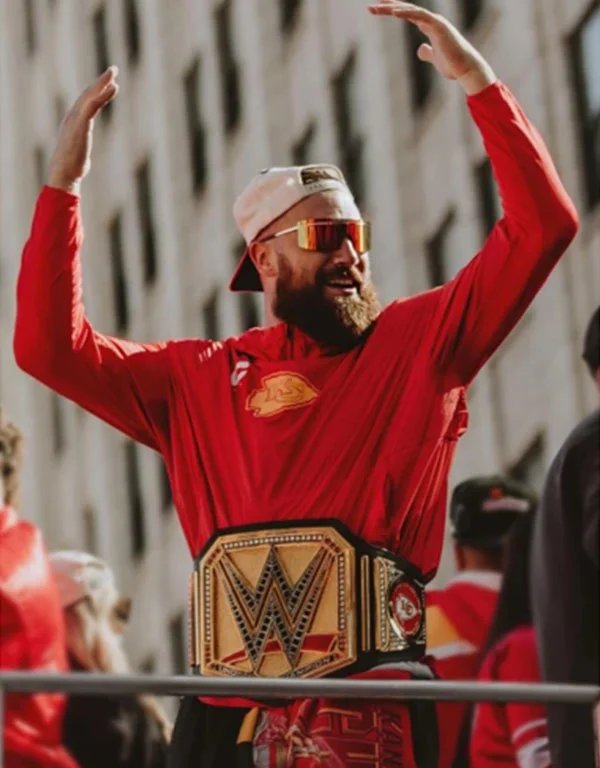nfl super bowl lviii 2024 travis kelce victory parade red hoodie 1